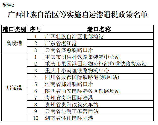 一、对符合条件的出口企业从启运地(以下称启运港)启运报关出口,由中国国家铁路集团有限公司及其下属公司承运,从铁路转关运输直达离境地(以下称离境港)离境的集装箱货物,实行启运港退税政策。启运港、离境港名单见附件。运输企业为中国国家铁路集团有限公司及其下属公司。运输工具为火车班列或铁路货车车辆。出口企业的出口退(免)税分类管理类别为一类或二类,并且在海关备案(失信企业除外)。(一)启运地海关依出口企业申请,对从启运港启运的符合条件的货物办理放行手续后,生成启运港出口货物报关单电子信息。(二)海关总署按日将启运港出口货物报关单电子信息(加启运港退税标识)通过电子口岸传输给税务总局。(三)出口企业凭启运港出口货物报关单电子信息及相关材料到主管退税的税务机关申请办理退税。出口企业首次申请办理退税前,应向主管出口退税的税务机关进行启运港退税备案。(四)主管出口退税的税务机关,根据企业出口退(免)税分类管理类别信息、税务总局清分的企业海关信用等级信息和启运港出口货物报关单信息,为出口企业办理退税。(五)启运港启运的出口货物自离境港实际离境后,海关总署按日将正常结关核销的报关单数据(加启运港退税标识)传送至税务总局,税务总局按日将已退税的报关单数据(加启运港退税标识)反馈海关总署。(六)货物如未运抵离境港不再出口,启运地或经停地海关应撤销出口货物报关单,并由海关总署向税务总局提供相关电子数据。上述不再出口货物如已办理出口退税手续,出口企业应补缴税款,并向启运地或经停地海关提供税务机关出具的货物已补税证明。对已办理出口退税手续但自启运日起超过2个月仍未办理结关核销手续的货物,除因不可抗力或属于上述第(六)项情形且出口企业已补缴税款外,视为未实际出口,税务机关应追缴已退税款,不再适用启运港退税政策。(七)主管出口退税的税务机关,根据税务总局清分的正常结关核销的报关单数据,核销或调整已退税额。六、在《财政部 海关总署 税务总局关于完善启运港退税政策的通知》(财税〔2018〕5号)第二条“政策适用范围”的“(一)启运港”中新增无锡(江阴)港。七、《财政部 海关总署 税务总局关于在粤港澳大湾区实行有关增值税政策的通知》(财税〔2020〕48号)所列启运港,均可作为经停港。承运适用启运港退税政策货物的船舶,可在经停港加装、卸载货物。从经停港加装的货物,须为已报关出口、经由上述离境港离境的集装箱货物。将财税〔2020〕48号文件第二条中规定的离境港“广州南沙保税港区、深圳前海保税港区”修改为“广州南沙新港、深圳港(含深汕特别合作区小漠港区)”。在财税〔2020〕48号文件附件中增列汕头市汕头港、广州市花都港、广州市广州南沙港、湛江市湛江港、江门市江门高新港、钦州市钦州港、儋州市洋浦港为启运港。八、各地海关和税务部门应加强沟通,建立联系配合机制,互通企业守法诚信信息和货物异常出运情况。各地财政、海关和税务部门要密切跟踪启运港退税政策运行情况,对工作中出现的问题及时上报财政部税政司、海关总署综合司及税务总局货物和劳务税司。九、本通知自2024年12月1日起执行。《财政部 海关总署 税务总局关于陆路启运港退税试点政策的通知》(财税〔2022〕9号)、《财政部 海关总署 税务总局关于增加陆路启运港退税试点的通知》(财税〔2023〕50号)同时废止。